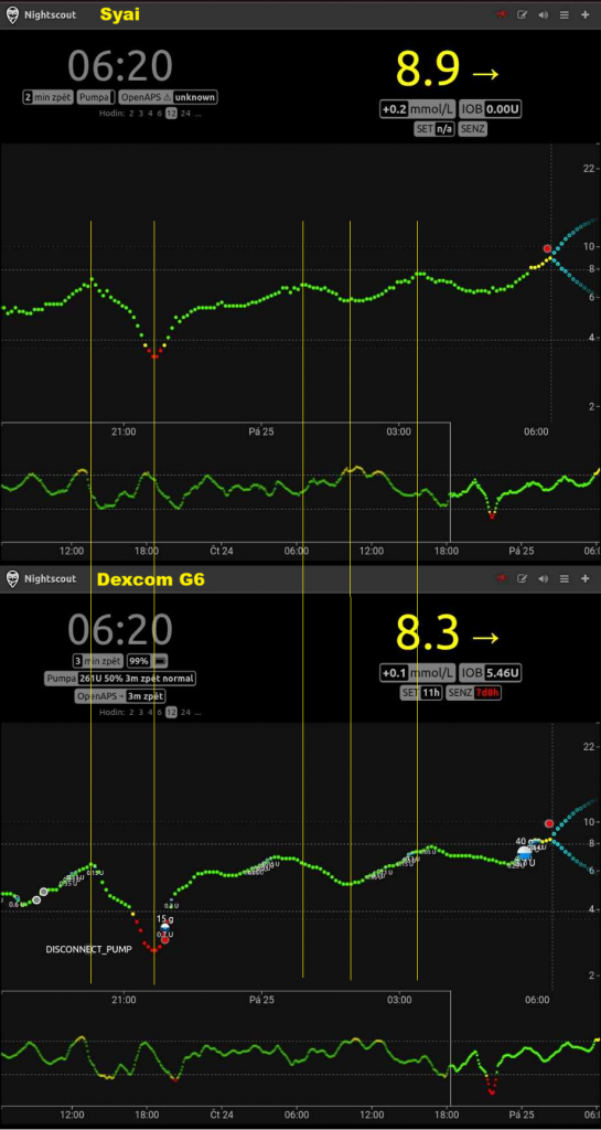 Potěšilo mě, že senzor od začátku nešuměl (v tom G7 prohrává hrozným způsobem), a měřil přesně. Měl jsem ho současně s G6, takže jsem koukal i jak je rychlý v reakcích na změny. Zjistil jsem, že G6 je o malý fousíček rychlejší. Taky se mi na začátku stalo, že při při glykémii 12,1 mmol/L na glukometru (chyba ve stravování, mazanec k večeři, po dvou hodinách rychlý vzestup z 6 mmol/L) ukazoval Syai 10,5 (G6 ukazovala 11,3). Další výtka – Syai nejde kalibrovat. Jednou jsem měl problém naopak při nízké – Syai ukazoval 5,4, podle glukometru jsem už měl ale méně než 4. Tam se ukázala G6 jako rychlejší – bylo to při rychlém poklesu a po 10 minutách Syai už ukazoval poměrně dobře – ale to už jsem pokles zajedl a byl tedy trend stabilní. Jinak ale senzor měřil celých 14 dní dobře, bez šumu a nepodařilo se mi jej ani jedenkrát zalehnout, což se mi u G6 stává poměrně často.