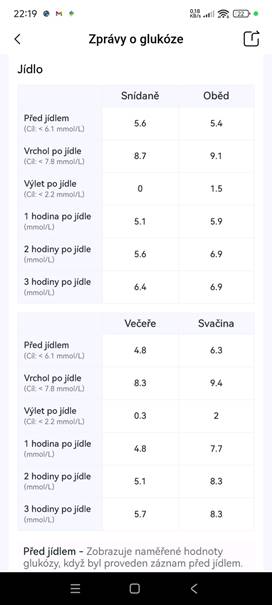 - Zpráva o glukóze – a toto mě nadchlo! Zde vidíte informace, které byly nasbírány za 14 dní nasazení senzoru – hlavička ve formě údajů o uživateli, senzoru a pak spousta statistik! Průměrná glykémie, čas v hypu, čas v hyper, čas v TIR, čas TiTR (% času strávené v přísnějším rozmezí, 3,9-7,8 mmol/L), glykémie v čase před jídlem, na vrcholu, výlet po jídle ( 😀 rozdíl mezi hladinou glukózy 2 hodiny po jídle a hladinou glukózy před jídlem – hrozný název (překlad), ale důležitý údaj), 1, 2 a 3 hodiny po jídle, grafické znázornění času v rozmezí, denní glukózové profily, ambulantní glukózový profil (percentil). Denní statistky glykémií okolo jídel, denní statistiky hypo/hyper, hodinové statistiky hypo/hyper, a na závěr grafy glykémií v jednotlivých dnech.